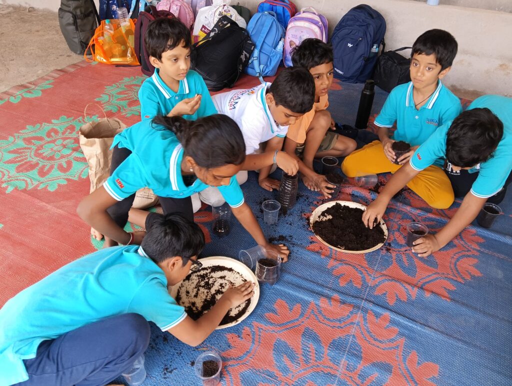 Next came the exciting part: sowing seeds. Each child was given three different creeper seeds. At first, most could not identify what they were holding, but with a few hints and clues, the answers burst out—bitter gourd, bottle gourd, and ridge gourd! They even learned the names of these vegetables in Telugu, making the activity both fun and culturally rooted.