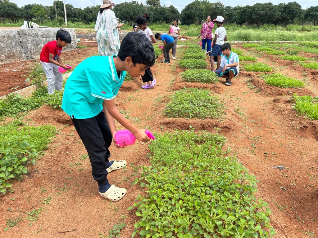 Meanwhile, the other group headed to their patches. There, they were introduced to the concept of pests—tiny creatures that can damage plants—and how farmers can protect their crops without chemicals. They discovered how neem oil, when mixed in the right proportion with water, becomes a powerful natural solution to control pests. Each child took turns preparing the mixture and spraying it gently on their plants. The joy was evident as they noticed their once-tiny saplings now grown into leafy greens, almost ready for harvest.