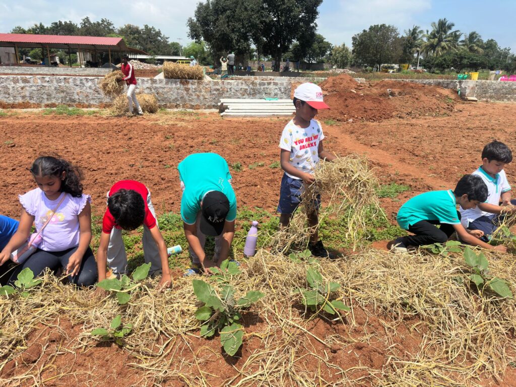 The learning didn’t stop there. After spraying neem oil, the children were guided to the vegetable beds, where they explored the practice of mulching. They discovered how natural materials like rice straw and fallen leaves could cover the soil to protect it. Mulching keeps the soil cool, conserves moisture, reduces weed growth, and prevents water evaporation. With great enthusiasm, the children spread rice straw around the vegetable patches, realizing how such simple steps can make farming more sustainable.