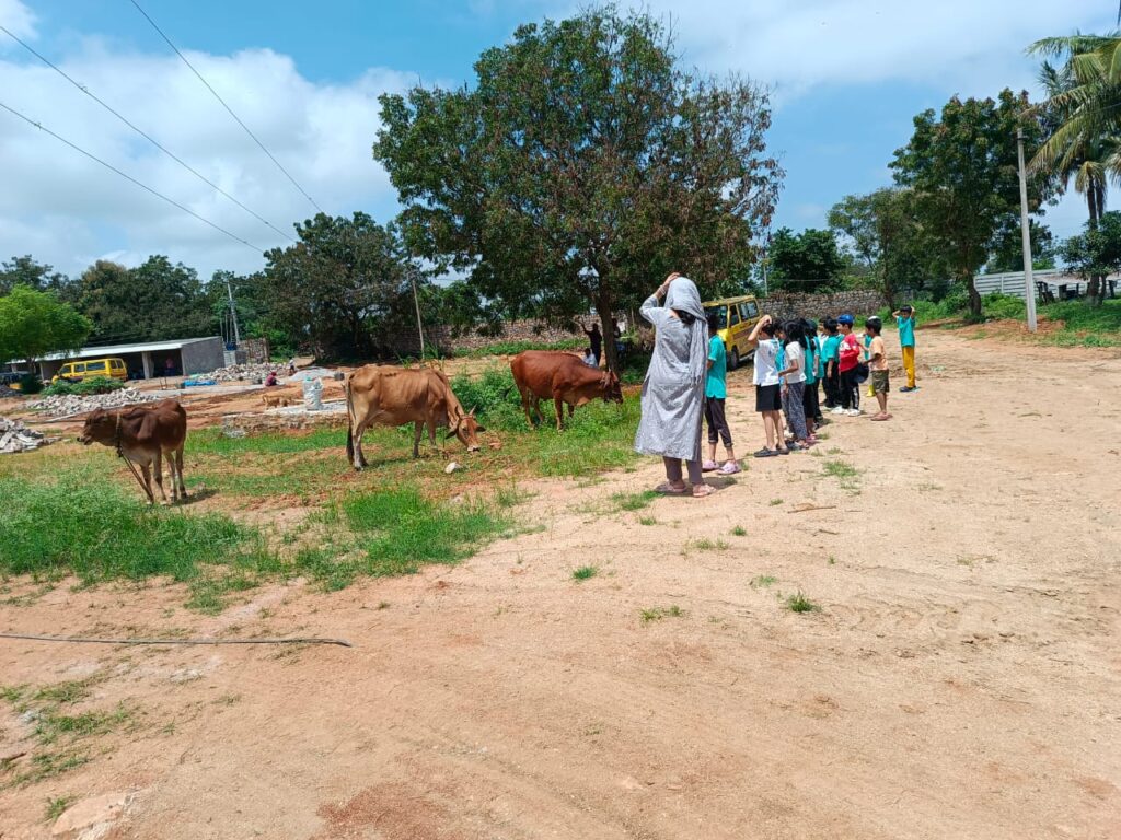Amidst all the activities, the children had a surprise visitor—the farm’s gentle cows. They gathered around curiously, some petting her softly, others watching them with wide eyes.