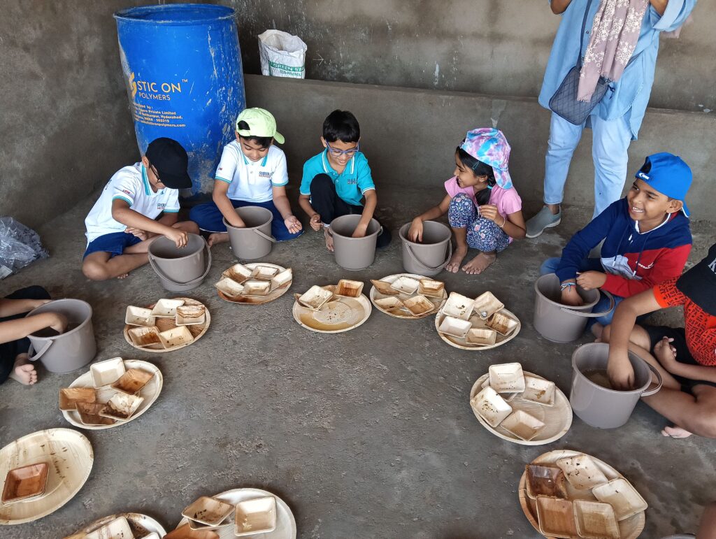 Meanwhile, the second group explored the world of weeds more deeply. Then came the highlight of their activity: making Jeevamrutham, a traditional natural fertilizer. A small container was placed before them, and into it went cow dung, cow urine, jaggery, soil, and besan flour. At first, many of them wrinkled their noses and hesitated to dip their hands into the mixture. But as soon as the mixing began, laughter and giggles filled the air. The hesitation quickly turned into excitement—the children were delighted to swirl the mixture with their hands, seeing how the different ingredients came together to create something life-giving for the soil.